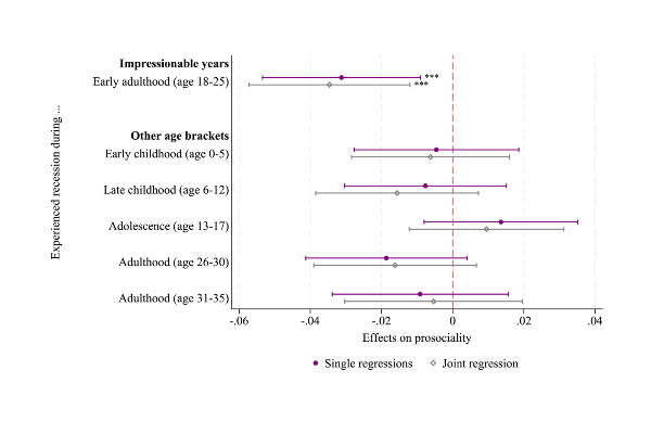 Social psychology has shown that early adulthood — roughly ages 18 to 25 — is a formative period for shaping attitudes, including prosociality. During this phase, individuals are particularly open to change and begin forming their social and economic identities. They transition into independence, engage with peers in new settings, start working, vote, and participate in civic life. Experiences during this period — including economic shocks like recessions — can leave lasting imprints on prosocial behavior.