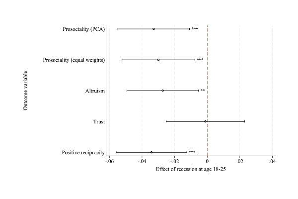 We find that going through a recession in early adulthood is associated with lower levels of prosociality later in life. The impact on trust is small and not statistically meaningful. Instead, the overall drop in prosociality seems to come from people being less altruistic and less willing to return favors — in other words, less reciprocal.